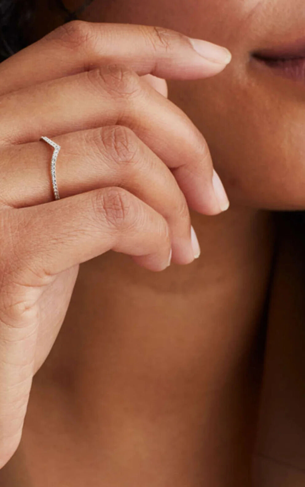 Een verfijnd ontwerp met een speelse, elegante touch. De subtiele V-vorm en sprankelende steentjes maken deze ring perfect om solo te dragen of te combineren voor een gelaagde look