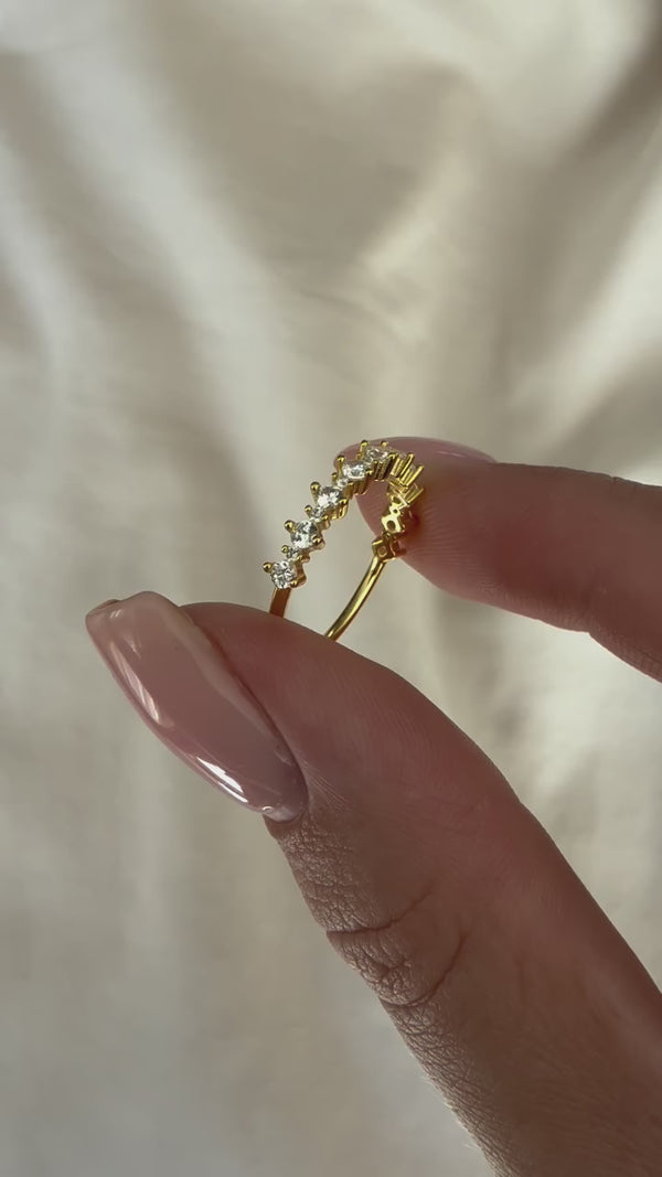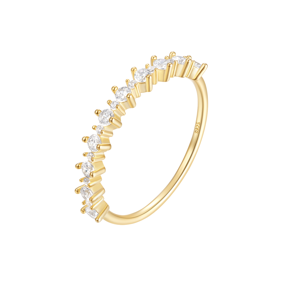 Deze elegante ring heeft twee verschillende formaat steetjes die een speelse, maar verfijnde uitstraling geven. Perfect om solo te dragen of te combineren met andere sieraden voor extra sparkle. Deze ring is gemaakt van hoogwaardig sterling zilver en afgewerkt met een prachtig laagje goud (vermeil) voor een luxe uitstraling