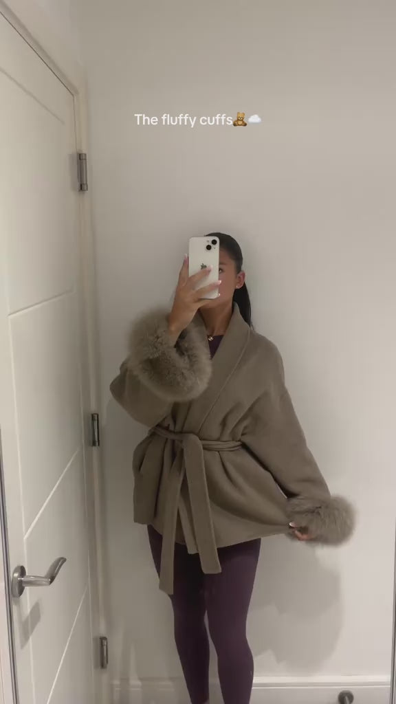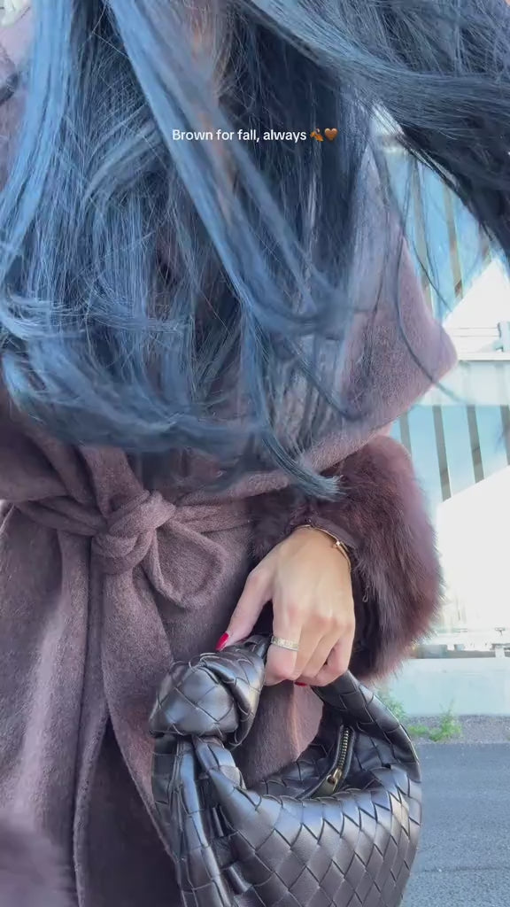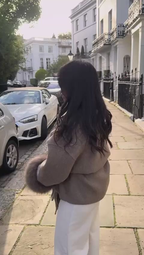 De Novae Coat is moeiteloos veelzijdig — draag hem op jouw manier. Combineer met of zonder de zachte vossenbont manchetten en riem om drie elegante stijlen te creëren, perfect voor elke gelegenheid of stemming.